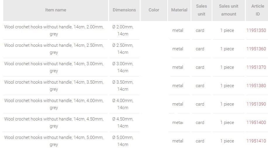 Wool crochet hooks without handle, silver-coloured, 7 variations